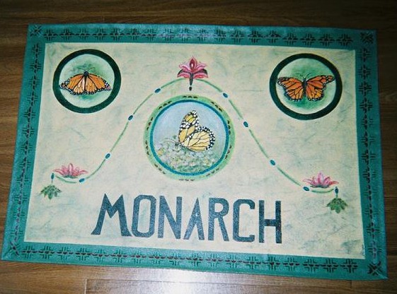 The Monarch Butterfly Floorcloth below was a gift to my daughter-in-law, Punam Thakran, for her store in Mill Valley, CA called Monarch. I especially loved painting the butterflies on this piece.